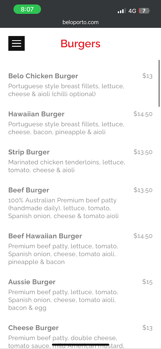 Nestled in the heart of Byron Bay at 3/73-75 Jonson St, Beloporto Burger Bar promises a mouthwatering culinary journey that will leave your taste buds tingling with delight. Our menu is a tantalizing showcase of flavorful creations, each crafted to perfection. Dive into our best-selling Aussie Burger, which captures the essence of a true classic with a gourmet twist. Or spice things up with our Chilli Chicken Burger Combo, perfect for those who love a little heat. If you're in the mood for a feast, the Chicken Burger Meal and Double Chicken Burger with Large Chips and Peri Peri Sauce are sure to satisfy your cravings. Don't miss our irresistible Burger Chips and Sauce, a match made in heaven! For something truly indulgent, the Double Double Hamburger and the tropical Chicken Hawaiian Burger are must-tries. And of course, our selection wouldn't be complete without the classic taste of our traditional 漢堡. Come savour the signature flavors that make Beloporto Burger Bar a must-visit dining destination in Byron Bay.